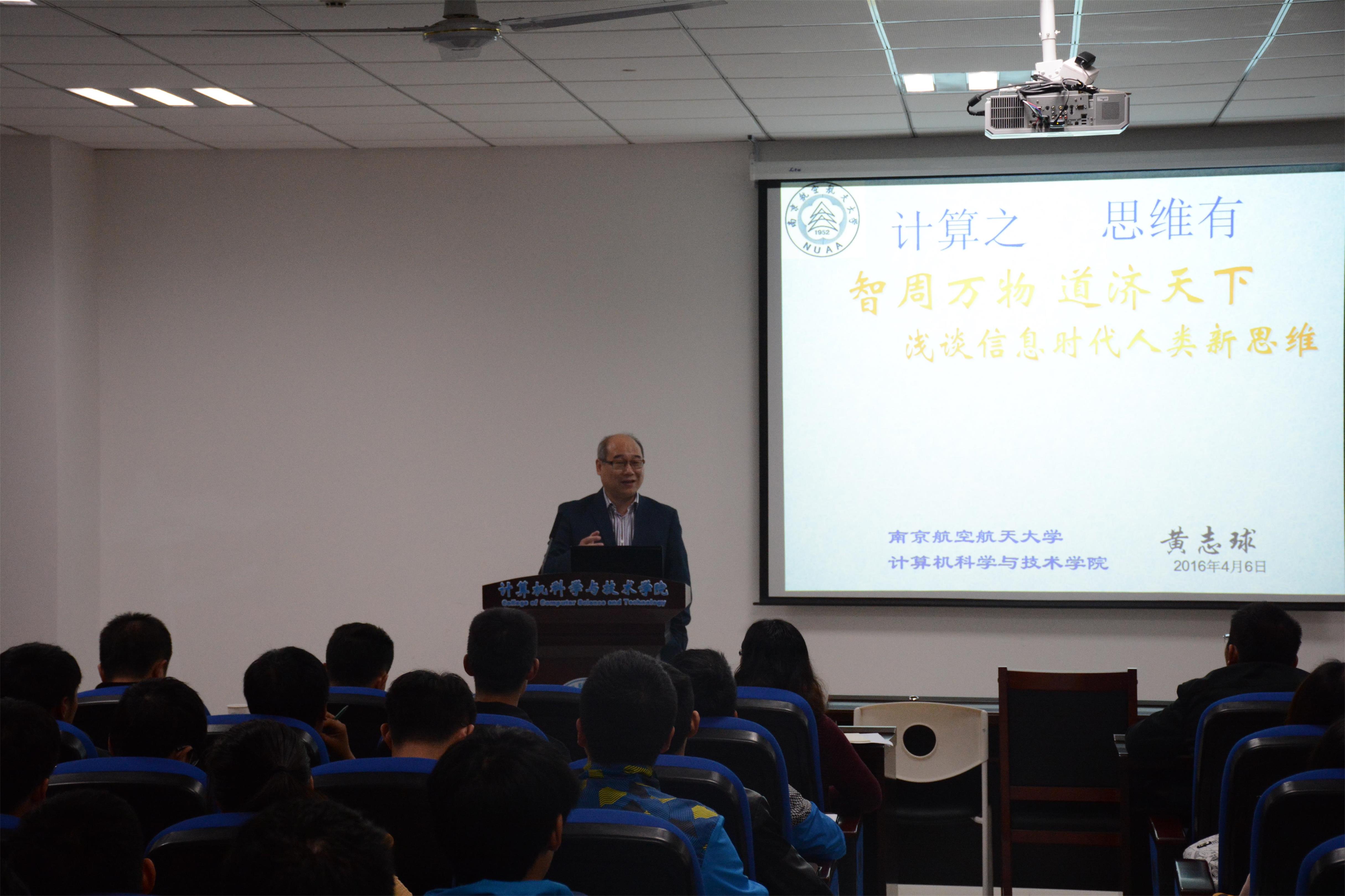 4月6日下午,计算机学院“石榴教授月导航”启动仪式暨讲座第一讲在学院楼113报告厅举行。计算机学院院长陈兵主持并宣布活动正式启动,学校副校长黄志球、教务处副处长江爱华、计算机学院党委副书记王霄、教务处学籍科科长潘顺荣及学院近200名一年级、二年级学生参加。第一讲是学院软件方向学科带头人黄志球副校长主讲的题为“计算之智周万物,思维有道济天下”的学术讲座。