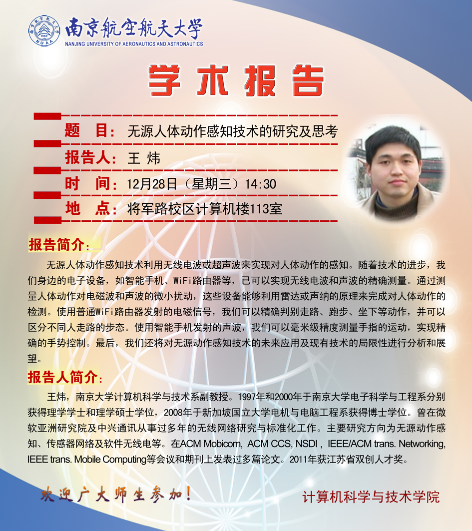 【学术报告】南京大学副教授王炜:无源人体动作感知技术的研究及思考