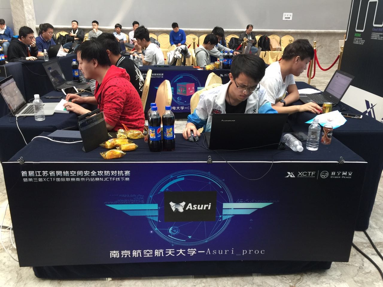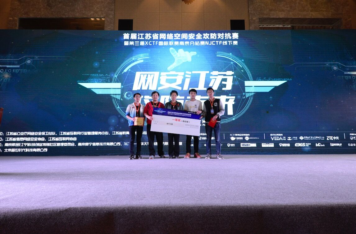 2017年4月18日,首届江苏省网络空间安全攻防对抗赛暨第三届XCTF国际联赛南京分站赛NJCTF线下赛在南京江宁未来网络小镇举行。经过线上赛的选拔,我校与南京大学、东南大学、南京理工大学、解放军理工大学、杭州电子科技大学等14所学校入围线下决赛。经过12小时线下决赛的厮杀拼搏,最终,我校13级信息安全专业张一白、14级信息安全专业罗思礼、15级信息安全专业张帅、16级测控技术与仪器专业的于文杰四位同学组成的的Asuri_proc战队以总分19743.9分领先第二名近6000分的绝对优势摘得比赛冠军。