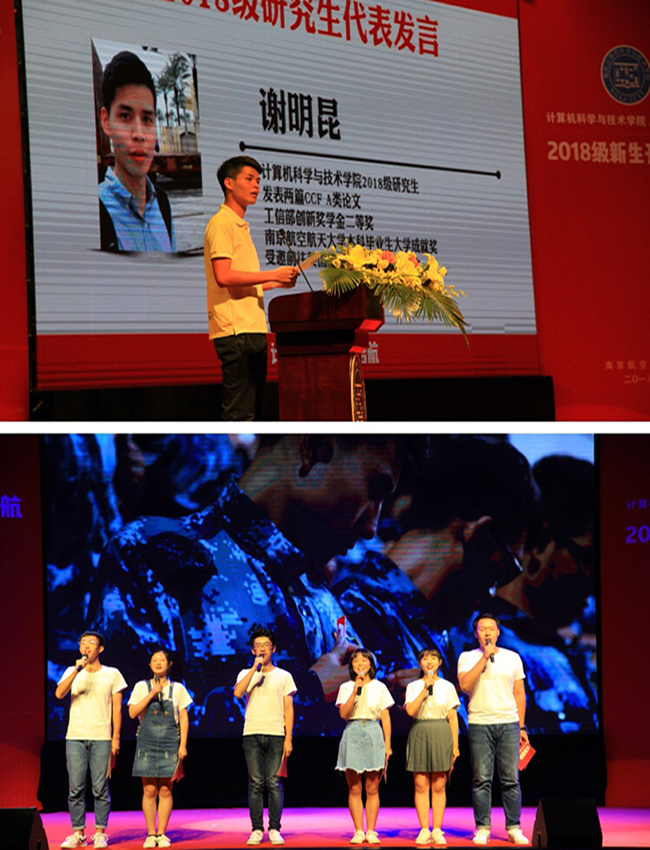 在第二篇章中,教授代表、班主任代表及两位分管本科、研究生教学的副院长分别发言,为新生未来的发展加油鼓劲。陈松灿教授作为教授代表,从自己的求学经历入手,勉励同学们要保持天然的求知欲,把有限的时间花在有用的知识学习上;要勤奋和忠诚,积累知识,并不忘初心,执着于自己的理想。2018级本科生班主任代表周宇老师寄语新生,勉励同学们在新环境下,不忘初心、不念过往、不惧将来,自律、自强、自信,在南航遇见更好的自己。此外,学院部分教师代表也通过视频为2018级新生送上了美好的祝福,希望他们珍惜大学时光,在未来的学习生活中不断提升自己,实现自己的人生目标。最后,副院长孙涵和副院长燕雪峰分别寄语2018级本科、研究生新生。孙院长希望同学们从小我走向大我,能够拥有远大的理想、恰当的学习方法和持之以恒的坚韧毅力。燕院长以诙谐的语言讲述了自己的求学经历,并要求研究生们潜心求学、勇于探索、注重学术诚信、多与导师交流探讨,珍惜研究生宝贵的学习时间,努力成就更好的自己。