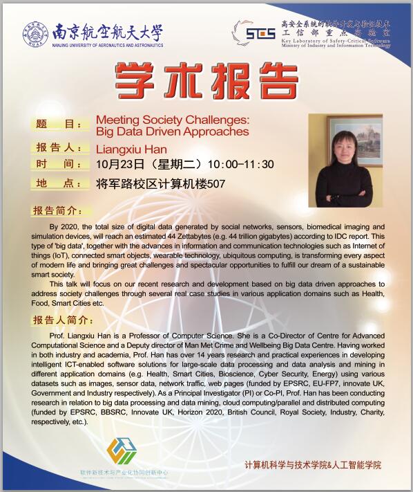 【学术报告】Liangxiu Han:Meeting Society Challenges: Big Data Driven Approaches