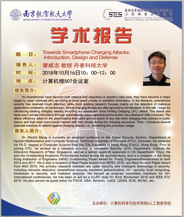 【学术报告】蒙威志 教授:Towards Smartphone Charging Attacks: Introduction, Design and Defense