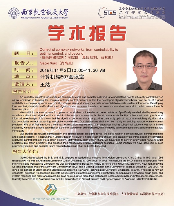 【学术报告】Gaoxi Xiao:Control of complex networks: from controllability to optimal control, and beyond