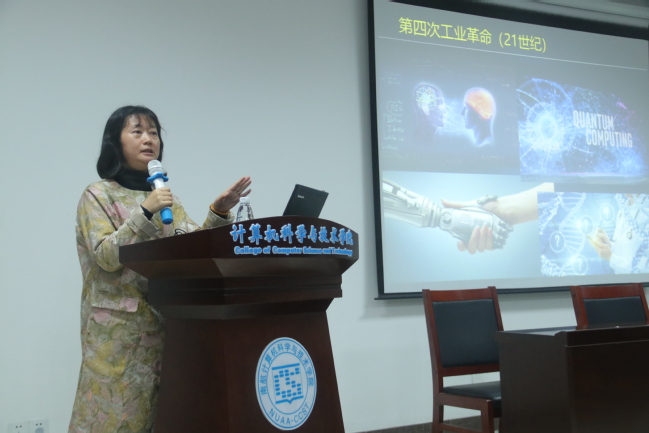 首先,刘教授从多次工业革命的历史渊源,引出创新对当代大学生的重要性。随后,又为大家解读了New York Times的文章,带领同学们理解和思考当前形势下学生应该学什么、能做什么。并强调计算机科学是21世纪的科学,引起在座同学的一致共鸣。
