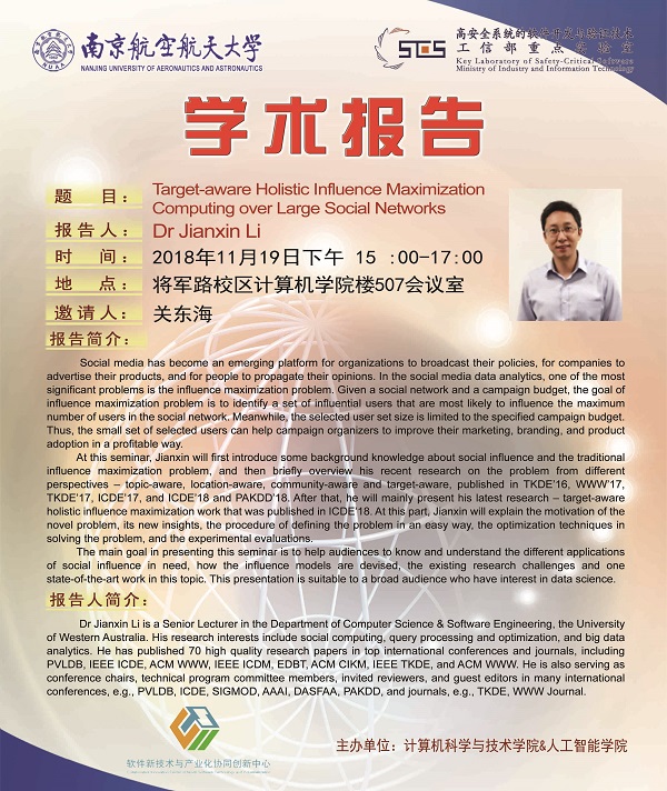 【学术报告】Dr Jianxin Li:Target-aware Holistic Influence Maximization Computing over Large Social Networks