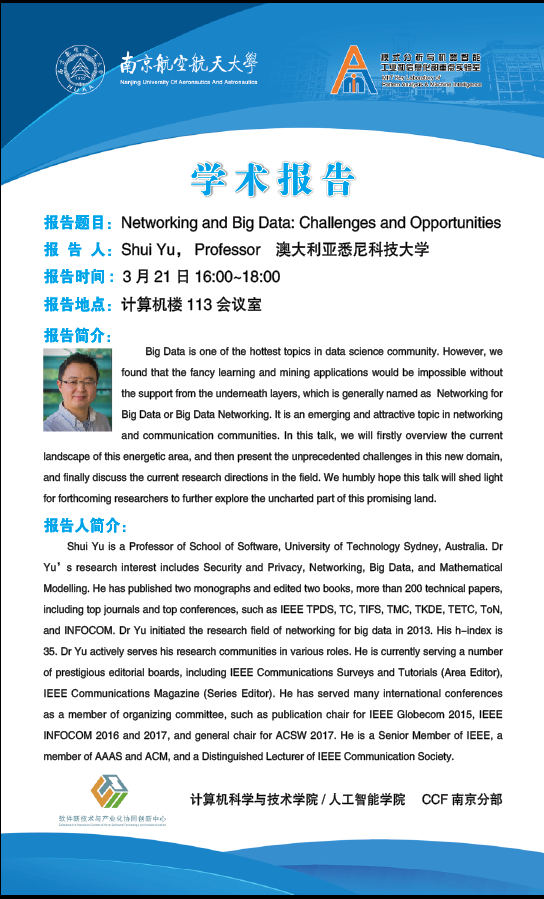 【学术报告】Networking and Big Data: Challenges and Opportunities
