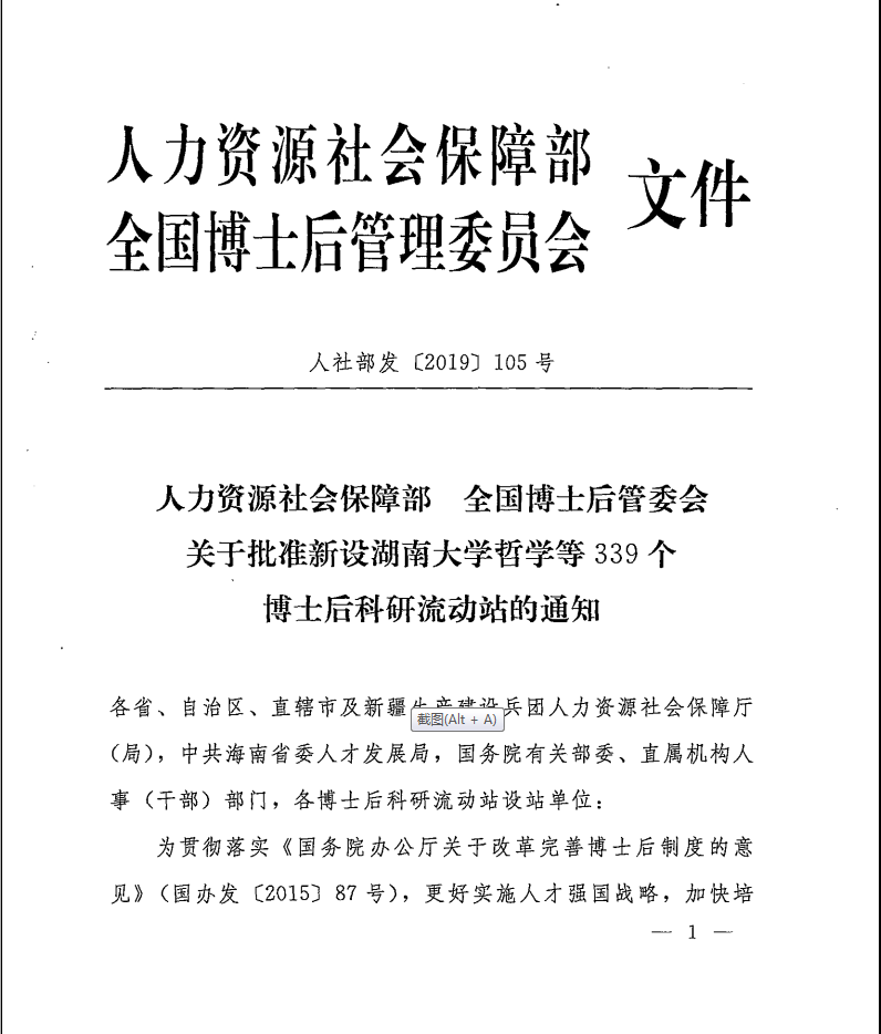 近日,人力资源社会保障部、全国博士后管委会联合下发《人力资源社会保障部 全国博士后管委会关于批准新设湖南大学哲学等339个博士后流动站的通知》(人社部发〔2019〕105号),经全国博士后管委会评审,人力资源社会保障部、全国博士后管委会研究决定,批准必威西汉姆联网络空间安全一级学科设立博士后科研流动站。今年是网络空间安全一级学科成立以来首次启动博士后流动站增设工作,很多计算机学科传统强校均参与本轮的申报工作,竞争异常激烈。
