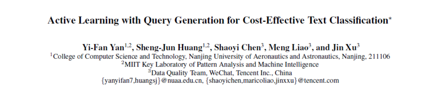 论文《Active Learning with Query Generation for Cost-Effective Text Classification》为与腾讯微信数据质量团队开展合作完成的一项成果。第一作者颜逸凡同学曾入选2018年度腾讯犀牛鸟精英人才培养计划(全国共58人入选)。该工作针对微信“看一看”功能中文本标注代价高的问题,提出了一种基于样本生成的主动学习方法,避免了对大规模未标记数据的重复扫描,能够直接生成最具有信息量和多样性的样本,从而快速提高模型性能,并能适用于大规模任务。同时,该方法利用稀疏重构技术对长文本进行 近似表达,使得标注者无需阅读整个文本,仅基于少量概括性词语就能进行高效标注,显著降低了标注成本。在模拟数据的可视化结果中,可以观察到所提方法生成的样本均匀分布在分类边界,表明其既有丰富的信息量,同时又能有效蕴含数据的整体分布信息。在真实数据集中的实验结果也表明该方法相比传统方法具有显著优势。