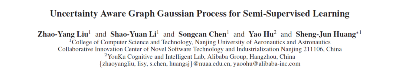 论文《Uncertainty Aware Graph Gaussian Process for Semi-Supervised Learning》为与阿里巴巴视频推荐团队合作完成。这也是双方继在优酷视频推荐实际任务中取得显著进展后,再次合作发表顶级会议论文。该工作主要面向标记数据不足的图网络数据提出了一种新的半监督学习方法。在很多现实任务中,数据以图网络的形式存在.在基于图的半监督学习中仅有部分节点有标记,需要依靠图的已标记节点构建模型预测其余未标记节点的标记。利用图的结构关系可以辅助模型学习更多的数据信息。该工作基于稀疏变分高斯过程提出了从特征聚合和光滑性假设两方面来利用节点关系:一方面特征聚合即基于图网络传播节点特征,同时聚合节点原始输入特征和高斯过程推断变量,另一方面对于聚合后所得概率变量施加对称马氏距离约束。实验结果显示提出的方法能够有效利用未标记数据提升模型性能。