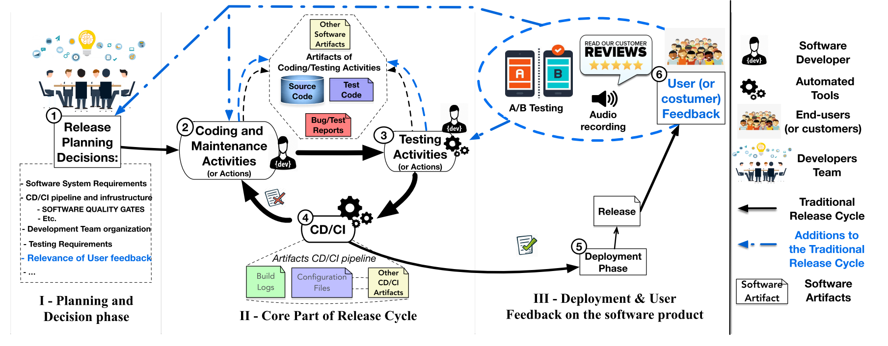 论文《User Review-Based Change File Localization for Mobile Applications》为与瑞士苏黎世大学等开展合作完成的一项成果。为了充分利用移动APP用户评论中的有用信息,该工作提出了通过话题分类、半聚类等方法对用户评论做初步分析,利用领域特定的约束信息和半监督学习将用户评论分组为与相似用户请求有关的多个细粒度群集。然后,通过结合版本控制工具的提交消息和源代码的文本信息,建立多个软件制品的关联关系,自动地定位潜在需要更改的源程序文件,满足用户提出的需求,从而来支持用户反馈的持续集成,可以加快迭代开发过程,更好地支持DevOps实践。实验表明,该方法在用户评论的聚类质量和更改源程序文件定位的准确率等方面要显著优于当前的主流方法。