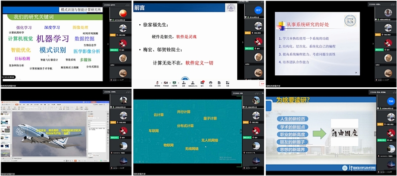 随后,学院五所一中心的教师代表就研究方向与师资力量等分别对研究所/中心的基本情况作了介绍。模式分析与智能计算研究所的袁伟伟老师以幽默的语言介绍了“可盐可甜”的模式所和“简约而不简单”的教师团队;软件研究所的周宇老师从梅宏、邬贺铨院士的“计算无处不在,软件定义一切”出发,详细介绍了软件所的研究方向和师资力量;数据管理与知识工程研究所的许建秋老师指出从事系统研究可以使编程结构化、层次化、系统化,同时培养团队合作能力;网络与信息安全研究所的方黎明老师介绍了安全所的学科基础和办学特色,号召同学们立足安全、服务国防,为航空航天科技保驾护航;网格与云计算研究所的许娟老师指出同学们要根据学习兴趣选择合适的研究方向;计算机工程技术中心主任燕雪峰老师介绍了中心的九大研究方向,同时他作为学院负责研究生教学管理的副院长,解读了学院研究生招生及培养相关政策,向优秀学子抛出了橄榄枝,并启动了2021年推免和报考学院研究生的微信咨询群。