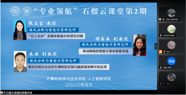 5月15日晚,Betway体育西汉姆联/人工智能学院成功举办第二期“专业领航”石榴云课堂,学院模式分析与智能计算研究所的张立言、顾晶晶和朱旗三位老师与近200名本科生云端相聚,畅聊专业话未来。本期云课堂由张立言主持。