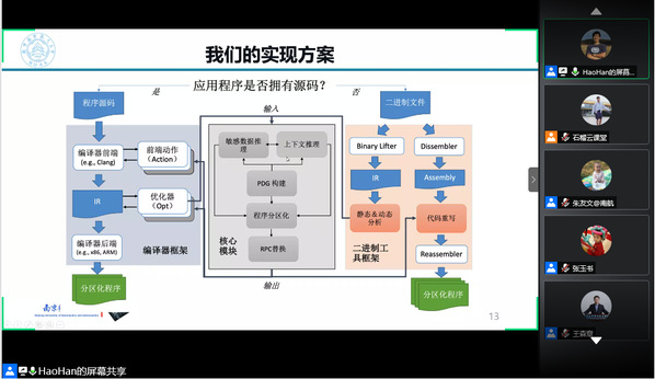 随后,韩皓从“什么是软件安全”、“软件安全为什么重要”、“为什么软件会不安全”、“提高软件安全的办法”几个问题展开,层层递进,概述了软件安全的相关内容。他结合程序自动安全分割和基于TEE的内核监控模块两个例子,指出提高软件安全的关键是一方面要提高软件的内生安全,另一方面要增加软件的外部保护。