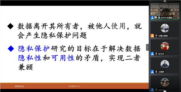 接下来,朱友文以“输入法智能联想”和“网购评价系统”为切入点,提出“能否既避免共享过程中的隐私信息泄露,又获得全面的分析结果?”的问题,引导学生积极思考,指出隐私保护研究的目标在于解决数据隐私性和可用性的矛盾,实现二者兼顾。随后,他介绍了目前几类常见的隐私保护技术,并对每一类技术所面临的问题和挑战作了深入分析。