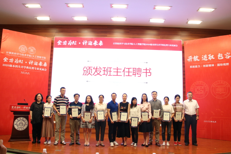 大学的学习需要自我管理与合理规划,同时也需要富有专业学识的良师为学生答疑解惑、指导发展方向,典礼现场,刘健荣宣读了2020级本科生班主任名单,与会班主任依次上台寄语新同学,希望各位同学要增进与班主任的交流,不断提升自身专业素养,助力自身成长成才。各位班主任的谆谆教诲和殷切嘱托必将有助于学生快速成长,梦圆南航。随后刘健荣和陈兵共同为2020级本科生班主任颁发了聘书。