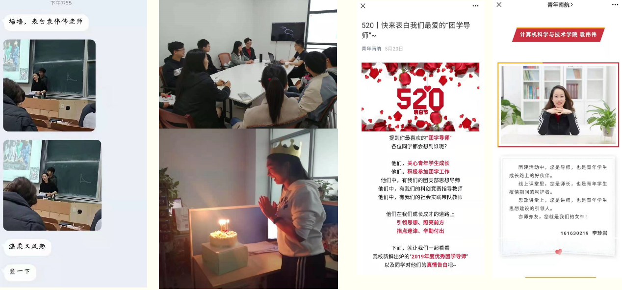 她是深受学生们喜爱的良师益友,自入职南航以来,全身心投入教育教学,是学生全面健康成长的指导者和引路人;她是在线教学和跨学科应用的积极探索者,近两年来荣获江苏省高等学校微课教学比赛一等奖、校教学创新奖一等奖、校“教师发展者”、校“课程思政”教学竞赛二等奖,在教学改革和课程思政等方面发挥了积极作用;她是校优秀共产党员和优秀团学导师,在2020年疫情期间,充分发挥党员先锋模范作用,为校园文化建设和学生思政教育作出了突出贡献,得到广泛的宣传和推广……她就是计算机科学与技术专业主任,被誉为最美网课“女主播”的袁伟伟老师。