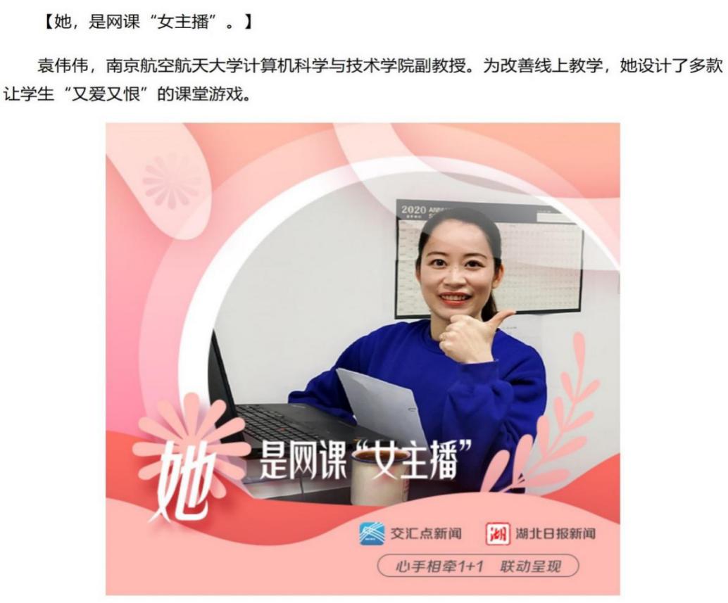 2020年“三八”妇女节,袁伟伟作为网课“女主播”代表,被《交汇点新闻》和《湖北日报》的心手相牵1+1活动报道,充分展示了我校教师抗疫期间奋战在教学一线的精神风貌,形成了良好的社会示范效应。