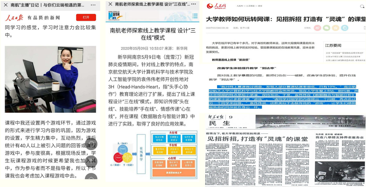 2020年初,突如其来的新冠疫情对正常教学产生了巨大冲击,所有课程均被迫改为线上教学,袁伟伟在疫情中勇于担当,时刻秉持以本为本的教学理念,用心钻研线上教学方法,持续推动教学改革,创造性地提出了线上教学“三在线”方法,不仅在课程中打破了传统课堂上由老师“包办”的旧模式,因势利导由学生主导多项课堂环节,还利用线上教学跨时空的优势,将不同专业的老师引入线上课堂,探索跨学科多专业有效协同的课堂教学模式,积极解决人工智能+领域的应用问题。她的教学方法被《人民日报》《人民网》《新华网》《新华日报》等多家主流媒体报道,获得了广泛的推广和应用。