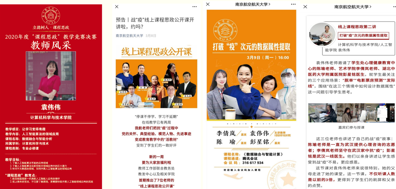疫情期间,袁伟伟积极开设课程思政公开课传递暖心温度。她邀请武汉抗疫一线医生、武汉普通民众、心理学专家等进入在线课堂,发挥线上优势讲述跨地域的战“疫”故事,得到学生们刷屏点赞。在日常课程中,袁伟伟积极探索将人工智能算法与航空航天领域应用相结合,鼓励学生践行南航人航空报国的精神,投身航空航天及国防领域中卡脖子问题的探索研究,相关内容获得江苏教育电视台、《南京日报》、《现代快报》等多家主流媒体报道。