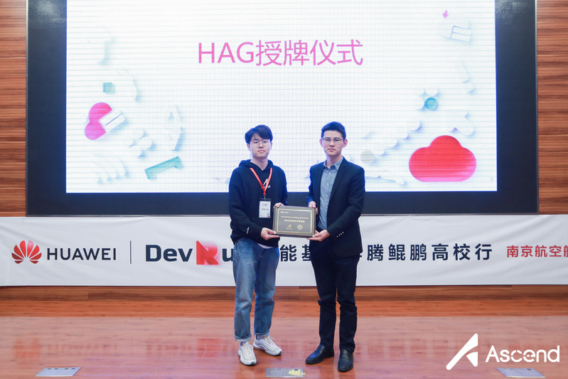 董羽为昇腾开发者协会(HAG)南航分会授牌。加入HAG不仅标志着南航-华为“智能基座”合作迈出重要的一步,也意味着南航师生将通过开放、创新、多元的昇腾开发者社区组织,共同探索昇腾技术、提升实践技能,助力全社会实现智能化转型升级。