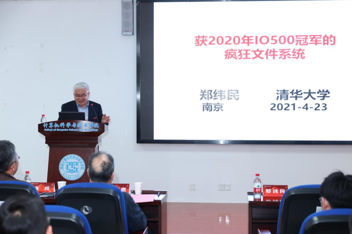 本次论坛共设三场特邀报告。郑纬民院士带来“获2020年IO500冠军的疯狂文件系统 ”专题报告。他首先介绍IO500测试的历史情况,随后对高性能计算机的存储结构演变和疯狂文件系统MadFS的结构进行了详细介绍。他在报告中介绍到由其团队研发的文件系统MadFS在IO500测试中,以7043.99分获得全球总榜冠军,这是国内科研机构首次夺得该排行榜榜首。这种创新架构的文件系统为航天大数据的快速分析提供了保证,也可以广泛应用于民用的大数据分析领域。