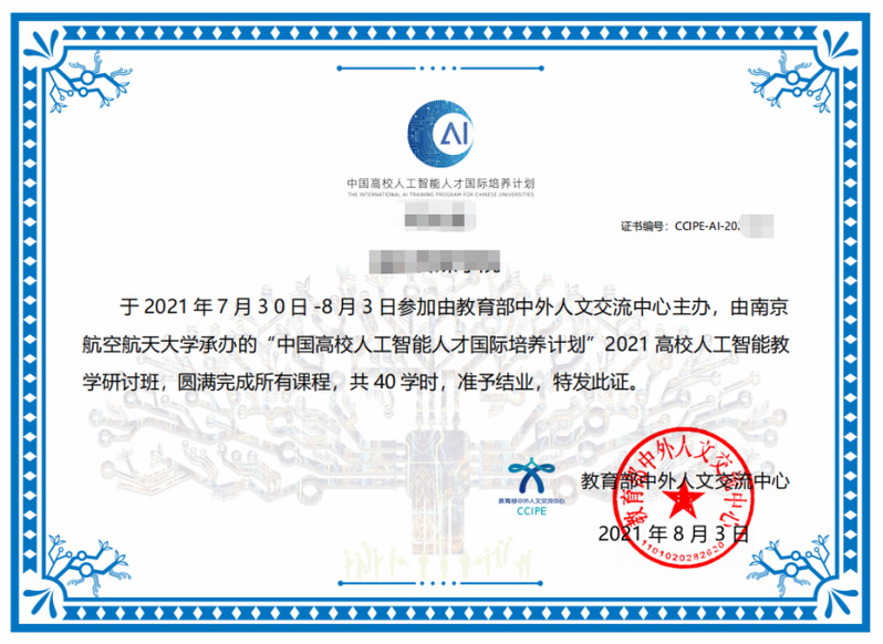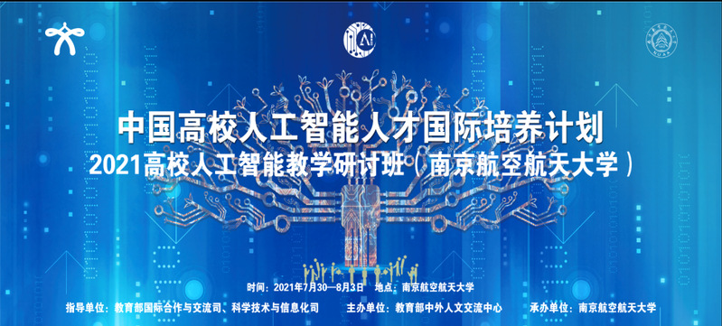 7月30日至8月3日,“中国高校人工智能人才国际培养计划”2021高校人工智能教学研讨班(必威西汉姆联)成功举办。本次研讨班由教育部国际合作与交流司、科学技术与信息化司指导,教育部中外人文交流中心主办,必威西汉姆联承办。来自南京大学、复旦大学、西安电子科技大学等全国近50所高校的100余名教师参加研讨班并顺利结业。