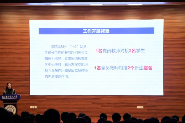 首先,院学生党总支组织委员、2017级本科生辅导员刘译善从工作背景和工作内容两方面介绍了学院本科生“1+2”助学生成长工作方案。在此项工作中,一名党员教师对接两个学生宿舍,围绕“三个一”开展工作,即一个学期至少开展两次线下交流活动、每个学生制定一个学年学习目标、为每位学生建立一份学生电子成长档案,旨在营造良好宿舍氛围,帮助低年级学生尽快适应大学生活,完成高中生到大学生的成功转型。
