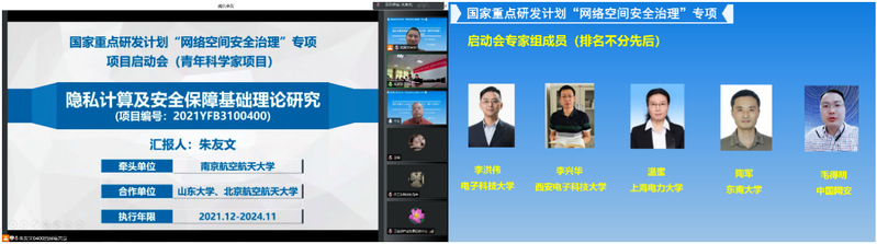 5月7日,我校朱友文教授牵头主持的国家重点研发计划“网络空间安全治理”重点专项青年科学家项目“隐私计算及安全保障基础理论研究”召开了项目启动会,会议采取线上线下相结合的形式进行。