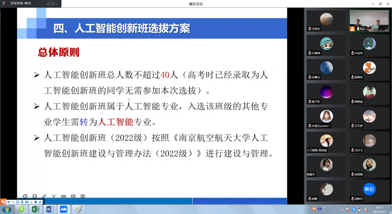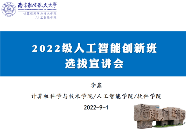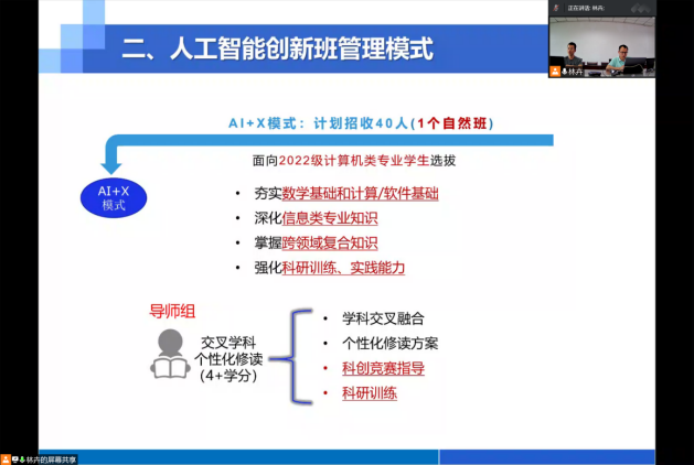 在宣讲环节,计算机学院副院长李鑫从人工智能创新班的管理模式、考核机制、选拔方案等角度全方位地向学院同学们介绍了本次选拔的基本情况。他指出人工智能创新班拥有雄厚的师资力量,配备优秀的导师队伍,真正实现“AI+X ”培养模式,鼓励有志于从事人工智能交叉研究的同学积极报名。2022级人工智能创新班班主任李野老师也参加了线上宣讲活动,他鼓励同学们积极报名参加创新班的选拔,并欢迎同学们加入。
