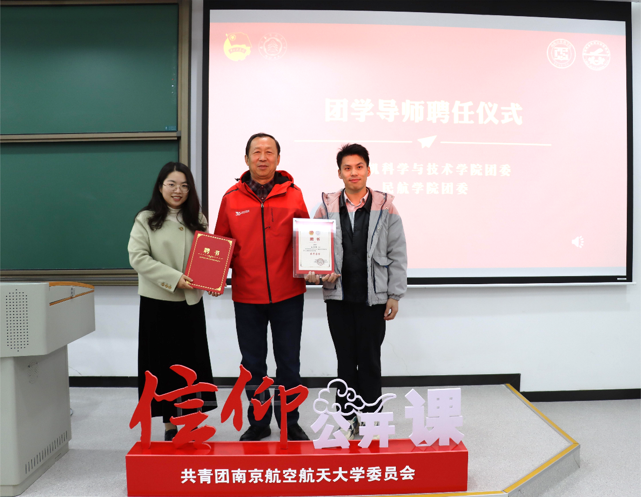首先,计算机学院团委书记孙明智、民航学院团委书记赵慧文为白万浬颁发“团学导师”聘书。