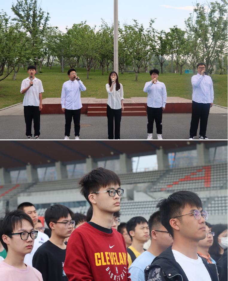 在慷慨激昂的旋律中,国旗班成员护送五星红旗入场。伴随着《义勇军进行曲》,五星红旗冉冉升起,全体人员肃立,行注目礼,齐唱国歌,向国旗致以崇高的敬意。