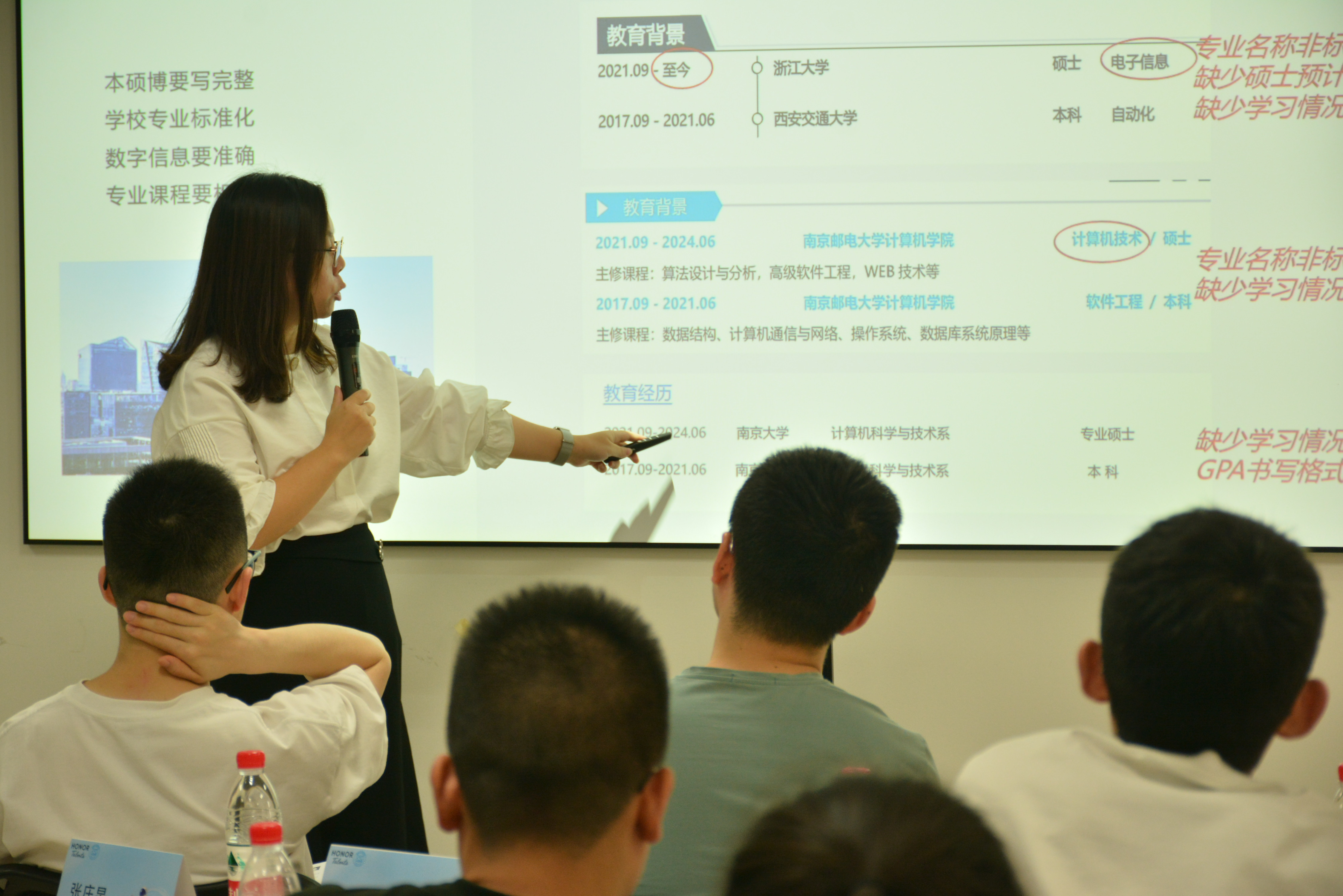 在简历优化环节,大家以小组为单位,对“问题简历”进行分析,通过演练掌握简历写作要点。基于同学们的分析结果,罗毅总结了简历写作的常见误区,并针对每个人的简历进行评估。分享结束后,罗毅、王坤现场为每位同学有针对性的修改简历。
