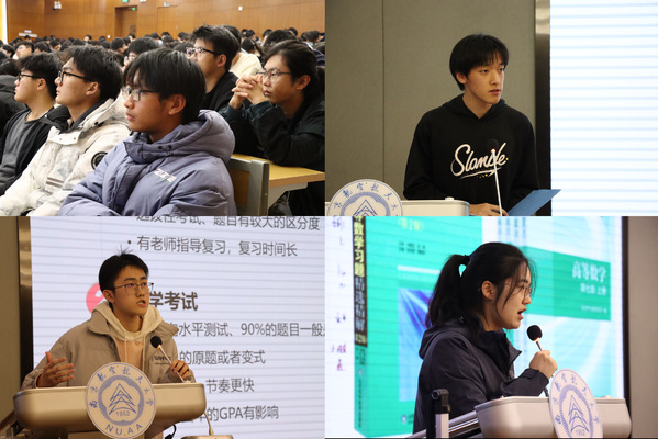本次月讲评还邀请到2022级本科生严子翼、陆齐嘉和刘佳伟分享自身在大一学年的“适应故事”。严子翼围绕学业适应话题,结合个人经历分享如何动态调整学习方法,实现学习生活中的“小目标”;陆齐嘉重点讲述了自己在科创竞赛等方面的丰富经验,鼓励同学们积极参与创新实践,不断实现自我突破;刘佳伟鼓励同学们理性看待学习压力,通过心理调适正确应对学习生活中的低谷,扎实走好大学生活的每一步。