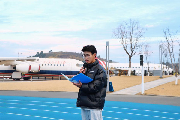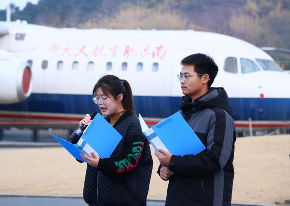 青春逢盛世,奋进正当时,学生代表李凌轩、黄智辉进行了《风华正茂扬风帆 筑我华夏新诗篇》主题诗朗诵,以饱含深情的语句鼓励同学们用实际行动践行爱国报国情怀,自立自强,表达了南航学子锐意进取、自强不息的坚定志向。