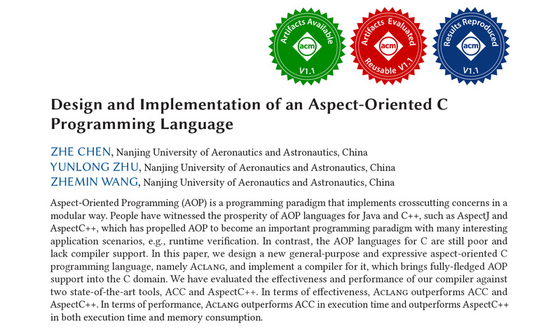 近日,我院题为“Design and Implementation of an Aspect-Oriented C Programming Language”的论文被程序设计语言领域国际顶级会议OOPSLA 2024录用。该论文的第一作者为我院陈哲副教授,作者还包括我院硕士生朱云龙、王哲民,我校为所有作者的唯一单位。这是我校在程序设计语言领域发表的第一篇CCF A类会议论文。
