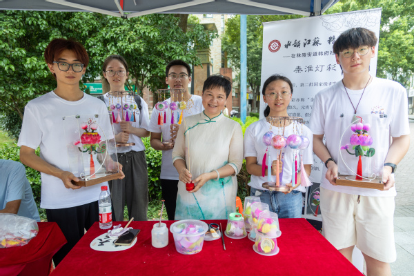 活动现场社区居民积极参与非遗作品的制作。在传承人指导下,孩子们学做十八翻、秦淮灯彩,爱美的女生学做谢馥春鸭蛋粉……活动现场,计算机学院的志愿者们化身“非遗推荐官”,用心捕捉细节,传递文化精髓。他们手持录像设备,对传承人进行采访,并充分利用抖音、视频号等新媒体平台,分享非遗技艺的精彩瞬间与背后故事。活动吸引了众多社区居民前来围观、体验、购买。