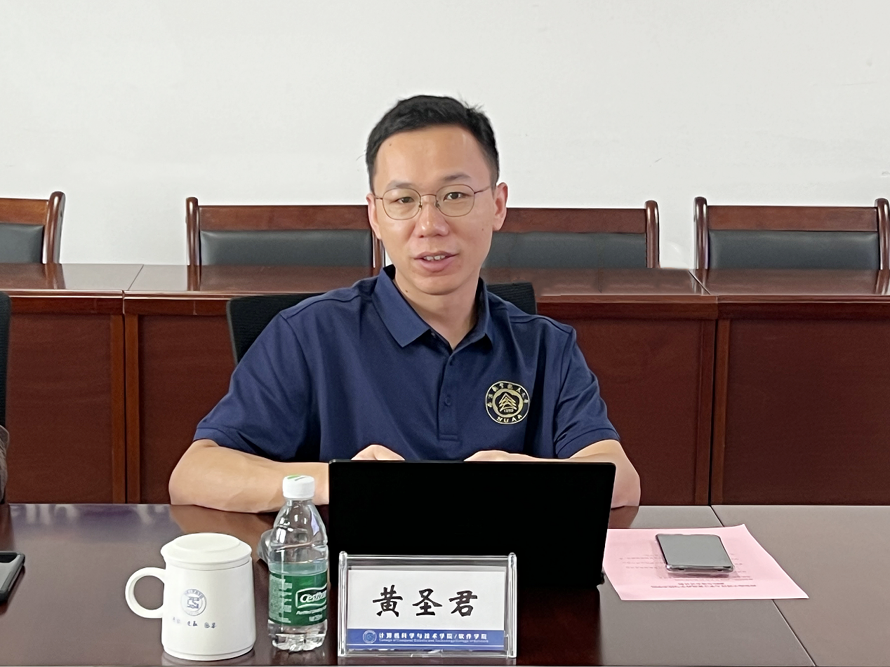 黄圣君对李青山一行到访学院表示热烈欢迎,他介绍了学校、学院基本情况,并从党建引领、学科建设、人才培养、师资队伍、科学研究等方面对学院近年发展作简要介绍,重点阐述了国家特色化示范性软件学院建设、学生竞赛指导等方面的创新做法。他表示,希望双方进一步加强合作交流,构建人才培养、联合攻关等常态化交流合作机制,在国防建设、国家信息化发展等领域持续发力,共同推动拔尖创新人才培养质量稳步提升,为服务国家重大战略需求献力量。