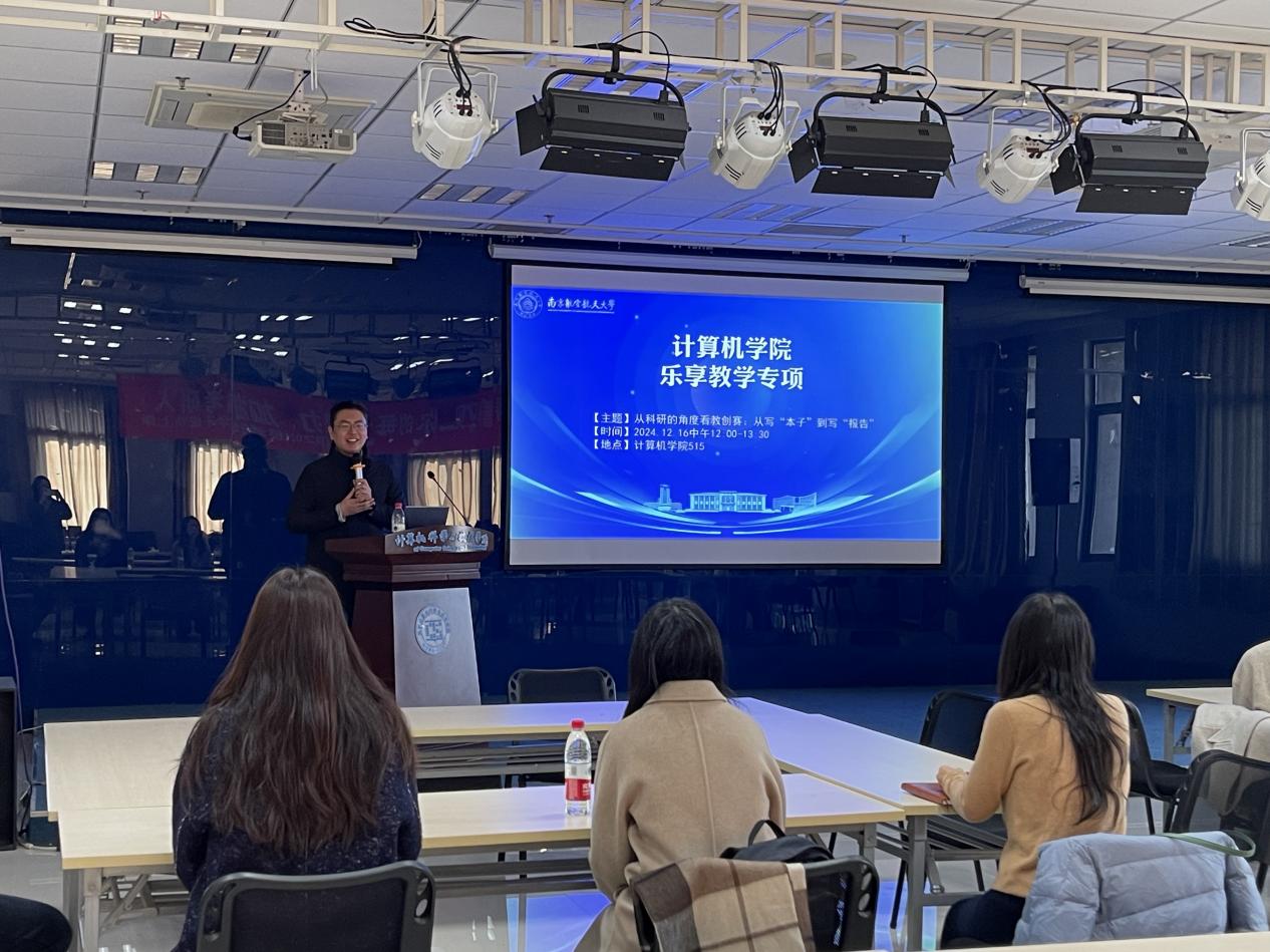 2024年12月16日,计算机学院开展题为“从科研的角度看教创赛——从‘写本子’到‘写报告’”的教学乐享活动。学院青年教师、第四届江苏省高校教师教学创新大赛特等奖获得者王肇康主讲,学校近30位教师参加本次乐享活动。活动由计算机学院教学办主任林卉主持。