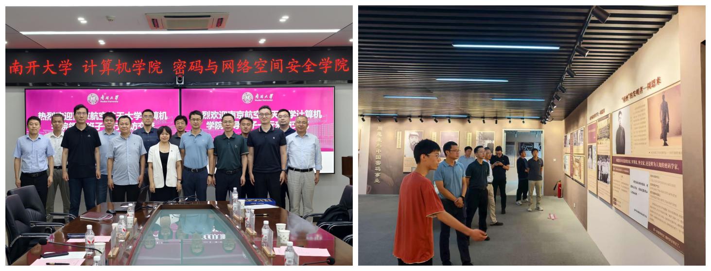 在南开大学计算机学院,院党委书记高琪、院长刘哲理、班子成员热情接待了调研组一行。双方各自介绍了学院的历史发展,围绕党建工作、学科建设、人才培养、师资队伍、科学研究、国际合作等情况,进行了深入交流。双方表示,两学院在办学历史、发展方向、机遇挑战等方面均有共通之处,期待未来在人才培养、学术交流、党建联建等方面持续深化合作,共同推动高质量发展。随后,参观了南开大学密码科普与“豪密”爱国主义教育基地馆,深入了解了南开大学计算机学科的发展历程。