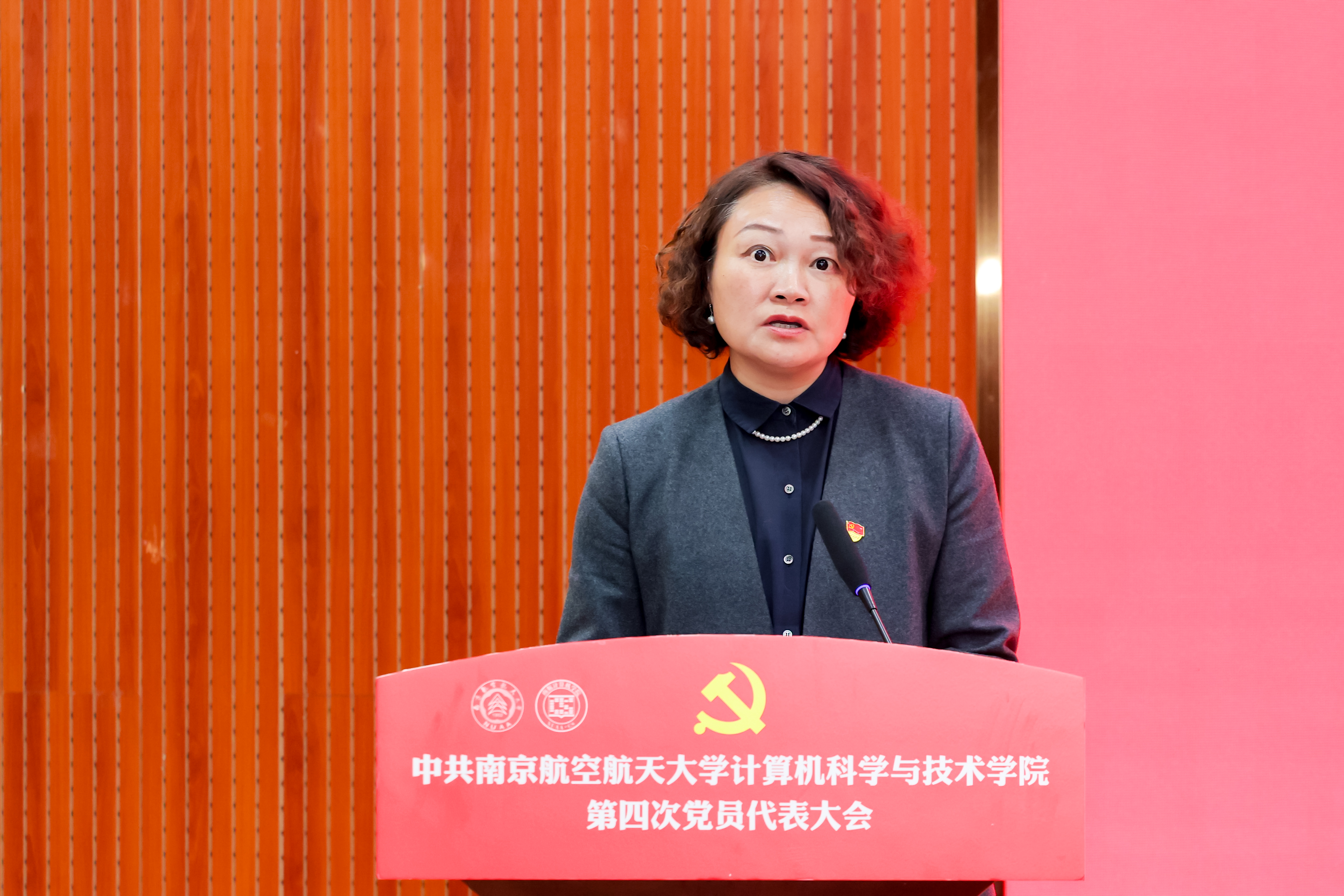 吴启晖代表学校党委对大会的召开致以热烈祝贺,充分肯定了学院党委过去五年取得的发展成效。他希望学院以此次大会为新起点,切实提高政治站位,以树立和践行正确政绩观为引领,牢牢把握信息赋能核心定位,坚持以标志性成果为导向,激扬拼搏斗志、勇闯发展新路。随后,他围绕“立党为公、为民造福、科学决策、真抓实干”总要求,结合计算机学科发展实际,对学院今后工作提出四点希望。一是要立党为公,坚守政治方向,以高质量党建领航计算机学科发展,赋能学校“三航”发展;二是要为民造福,聚焦师生需求,有针对性解决师生在科研攻关、教学实践、就业发展等方面的急难愁盼,增强全院师生归属感与幸福感;三是要科学决策,立足计算机学科核心优势,紧扣国家数字战略,明确学院主攻方向,做强优势学科、布局前沿领域,持续提升学科核心竞争力;四是要真抓实干,锤炼过硬作风,以实干破解技术瓶颈、推动工作落地,切实把党代会部署转化为发展实效,奋力谱写计算机学院高质量发展新篇章。